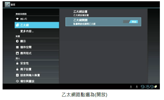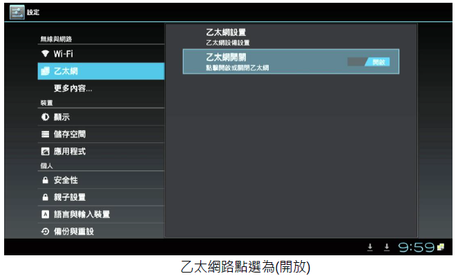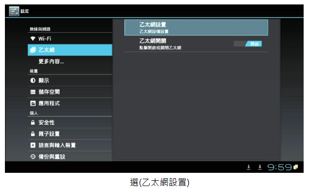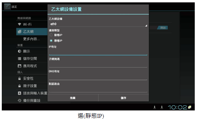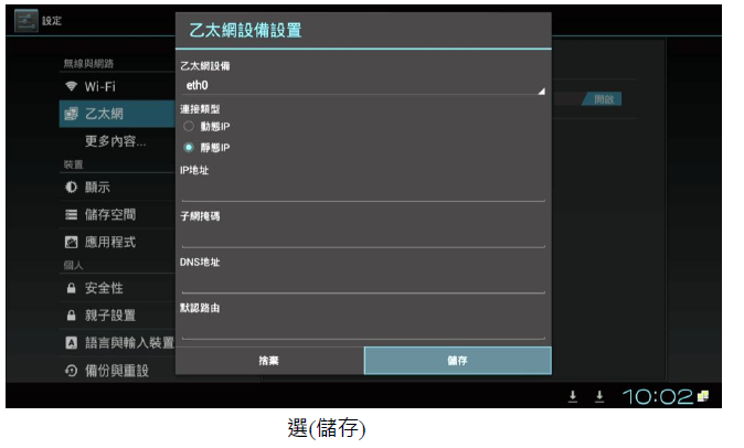 2. 進入撥放器中的(本機設定),選擇(乙太網)並且將右邊的關閉點選為(開啟), 再選擇乙太網設置,再選擇(靜態 IP)並輸入您 IP 的相關資料(IP 地址 、子網掩碼、DNS 地址、 默認路由 )或詢問 MIS(網管人員)提供的 IP 相關資料填入(不能空白),再做(儲存)即可