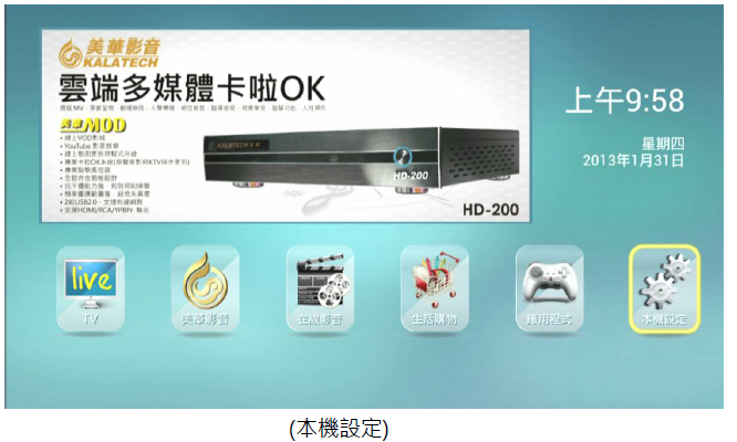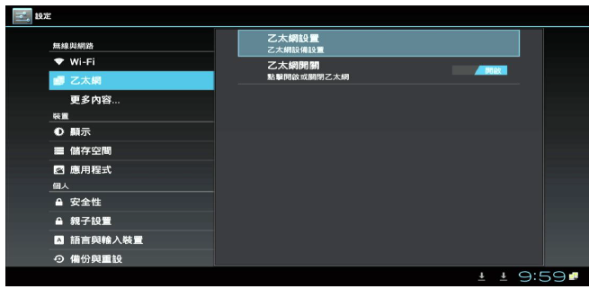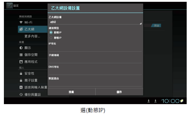 2. 再進入撥放器中的(本機設定),選擇(乙太網路)並且將右上角的關閉點選為(開啟),再選擇(動態IP)後將游標移到(儲存)即可