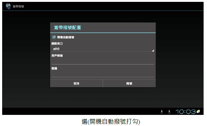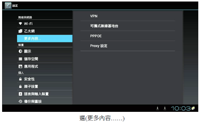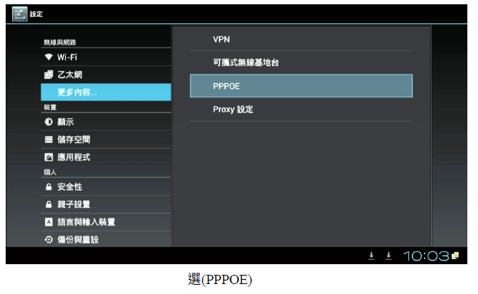2. 進入撥放器(本機設定)中的(更多內容),選擇 PPPoE 並且輸入(帳號).(密碼)