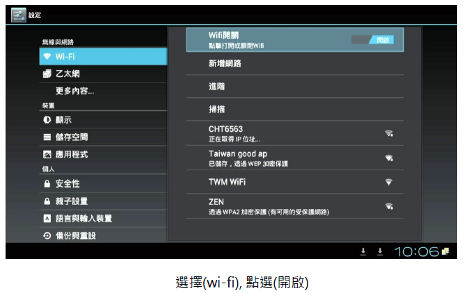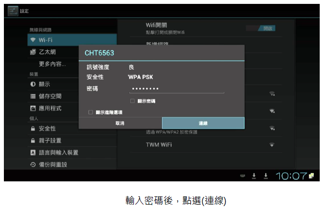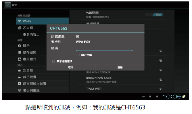 游標移到該網路後.輸入密碼後 顯示(已連線)即可