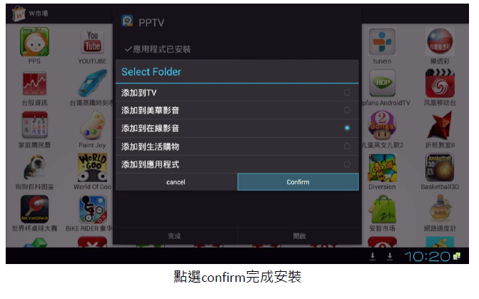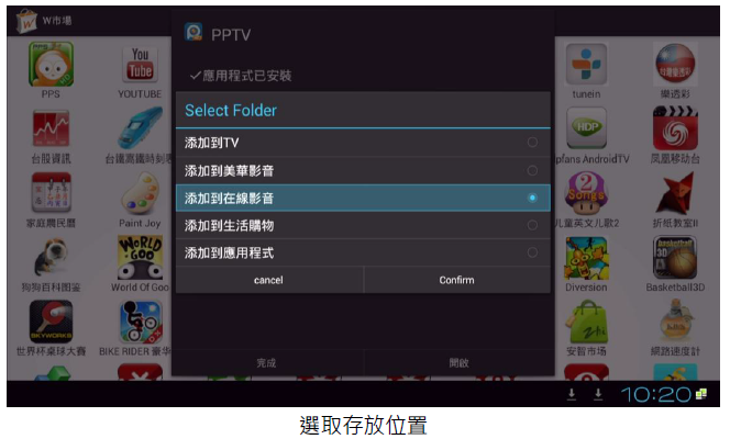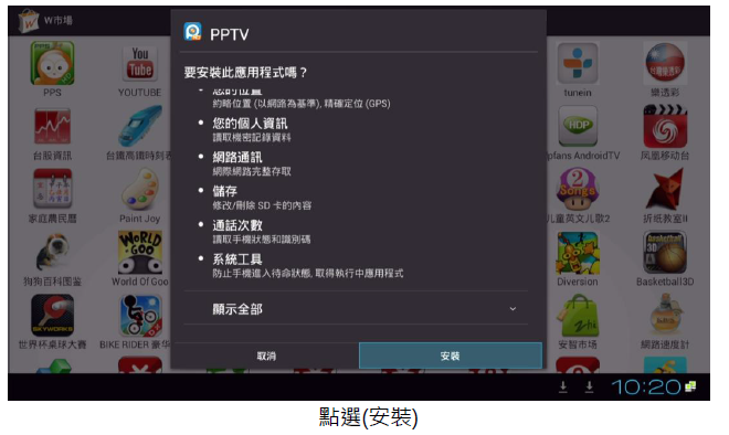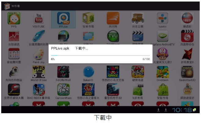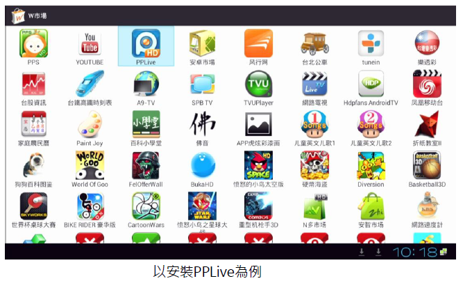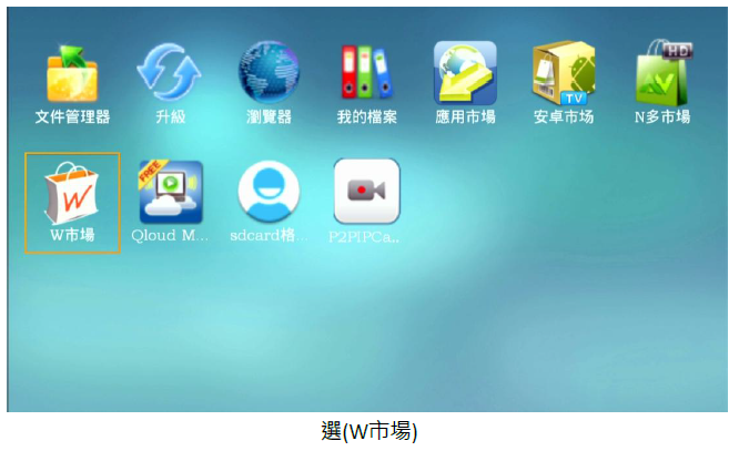 進入(應用程式)中的(W市場…),再選擇要安裝的 APK 進行(下載)後再 (安裝)。安裝完後,再進行