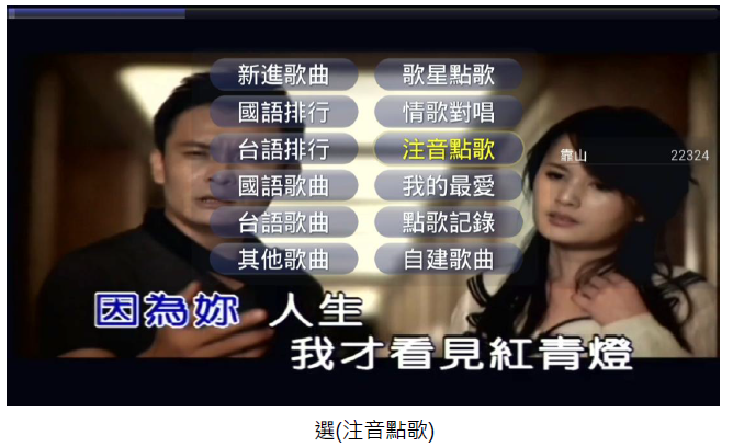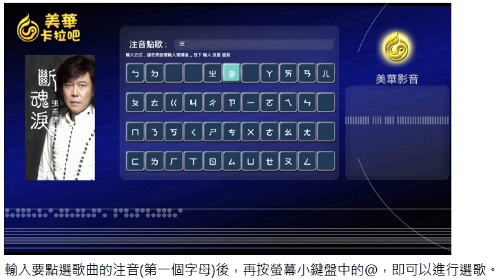 2. (注音選歌)選擇操作,輸入要點選歌曲的注音(第一個字母)後,再按螢幕小鍵盤中的@,即可以