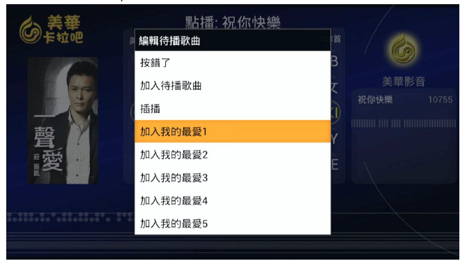 3. (我的最愛) 選擇操作.進入卡拉 OK 選取要唱的歌曲時,按遙控器(OK 鍵) 3-4 秒選擇可分類(加入我的最愛一.二.三.四.五.)